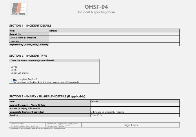 Included in this pack: an OHS policy, risk management procedure, incident reporting and investigation forms, risk assessment template, induction and consultation records.